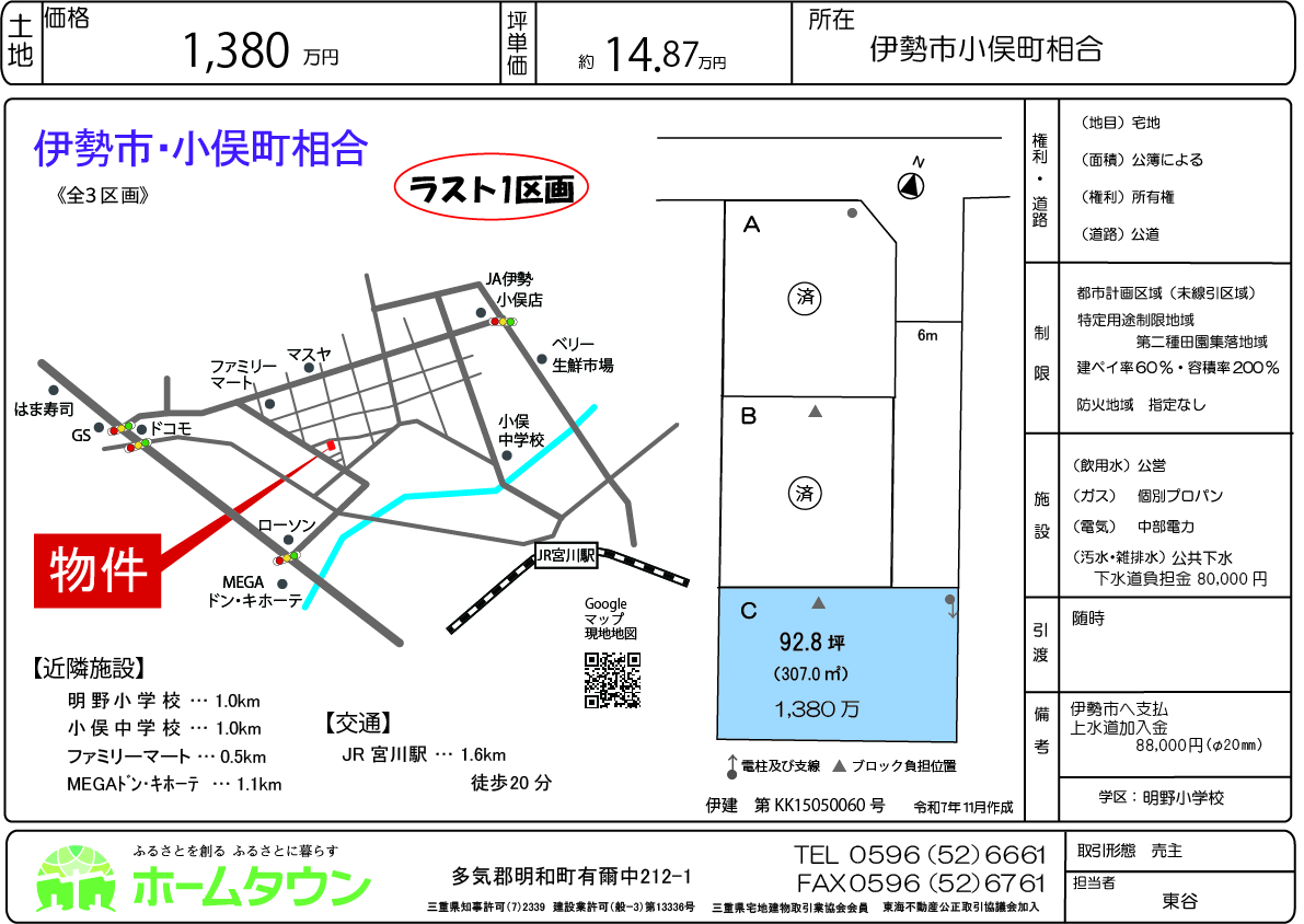 土地伊勢市・小俣町相合(売主)値下げしました!90坪超の土地人気の伊勢市小俣町地区。全3区画とも80坪超のゆったりとした土地です。